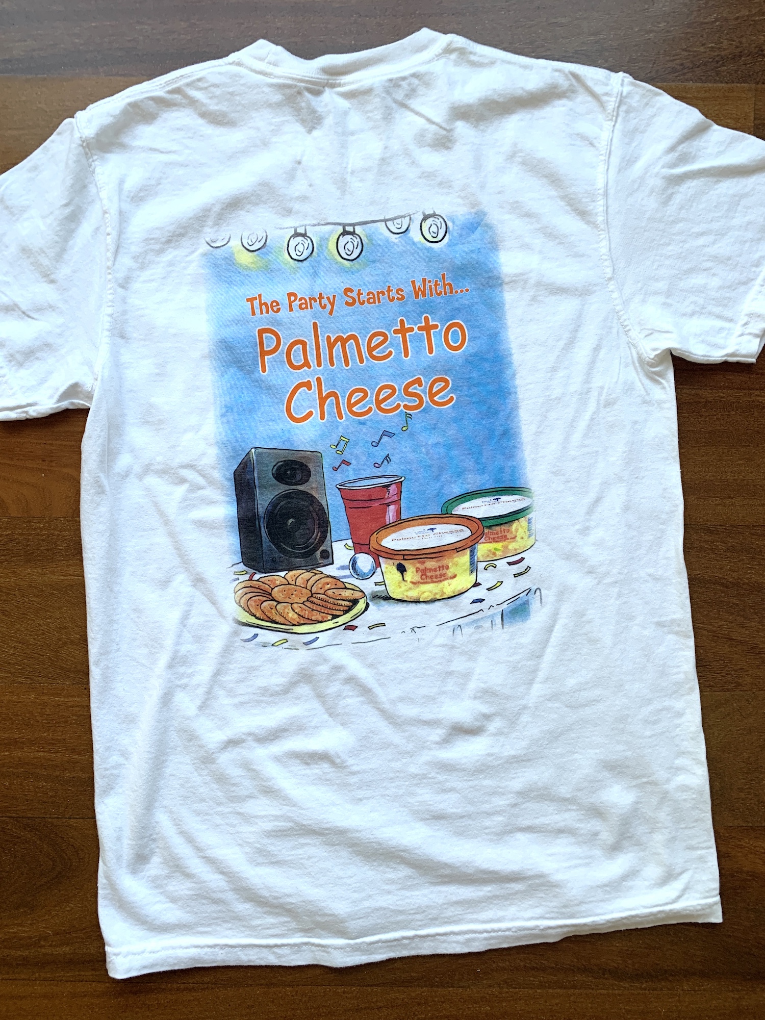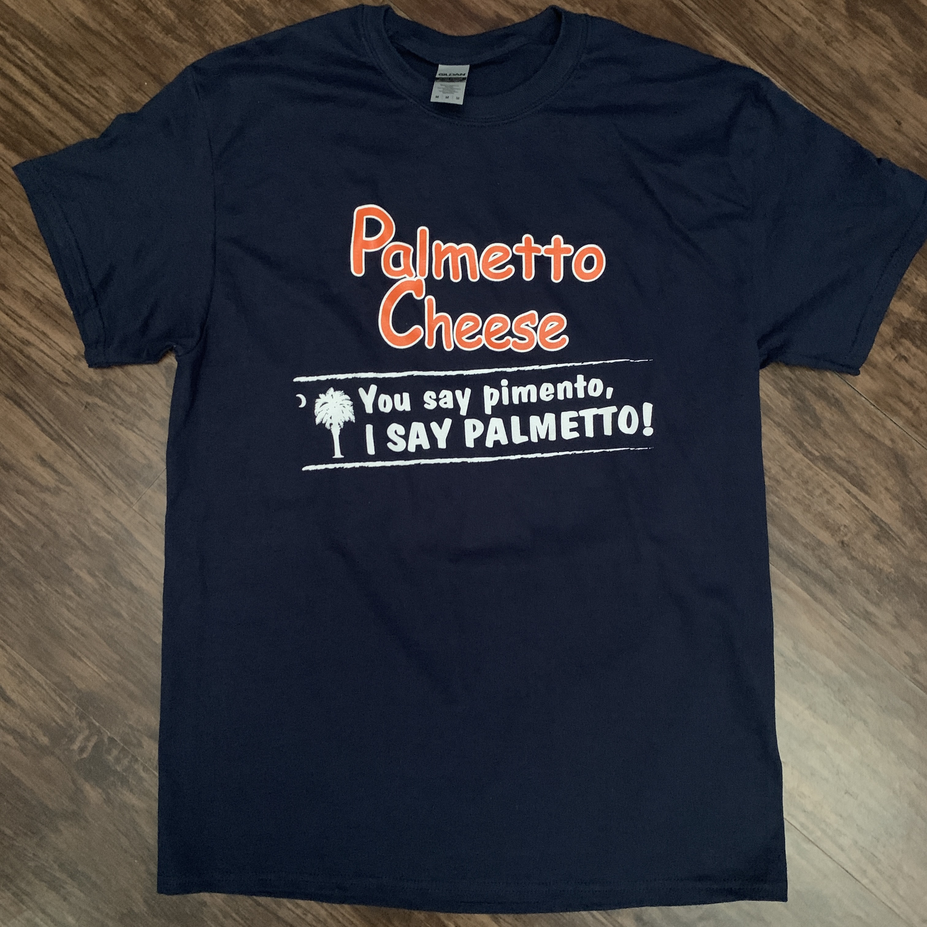 White and Navy Blue Limited availability on all sizes All Palmetto Cheese merchandise has FREE SHIPPING. The T-shirts feature the Palmetto Cheese logo with Palmetto Tree and Crescent on the front and Palmetto Cheese Liked and Shared since 2006 on the back. A search on Saturday revealed pimento cheese shirts going for as much as 120 on eBay.